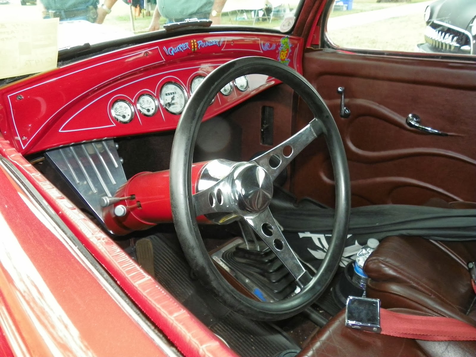 1932 Ford 5-window Coupe... Hard to go wrong with a Deuce. This is probably the iconic year of hot rods down through the years. The paint was well applied and the color unusual. The dash could not be any simpler.. and like most good Fords, it has a Chevy engine.